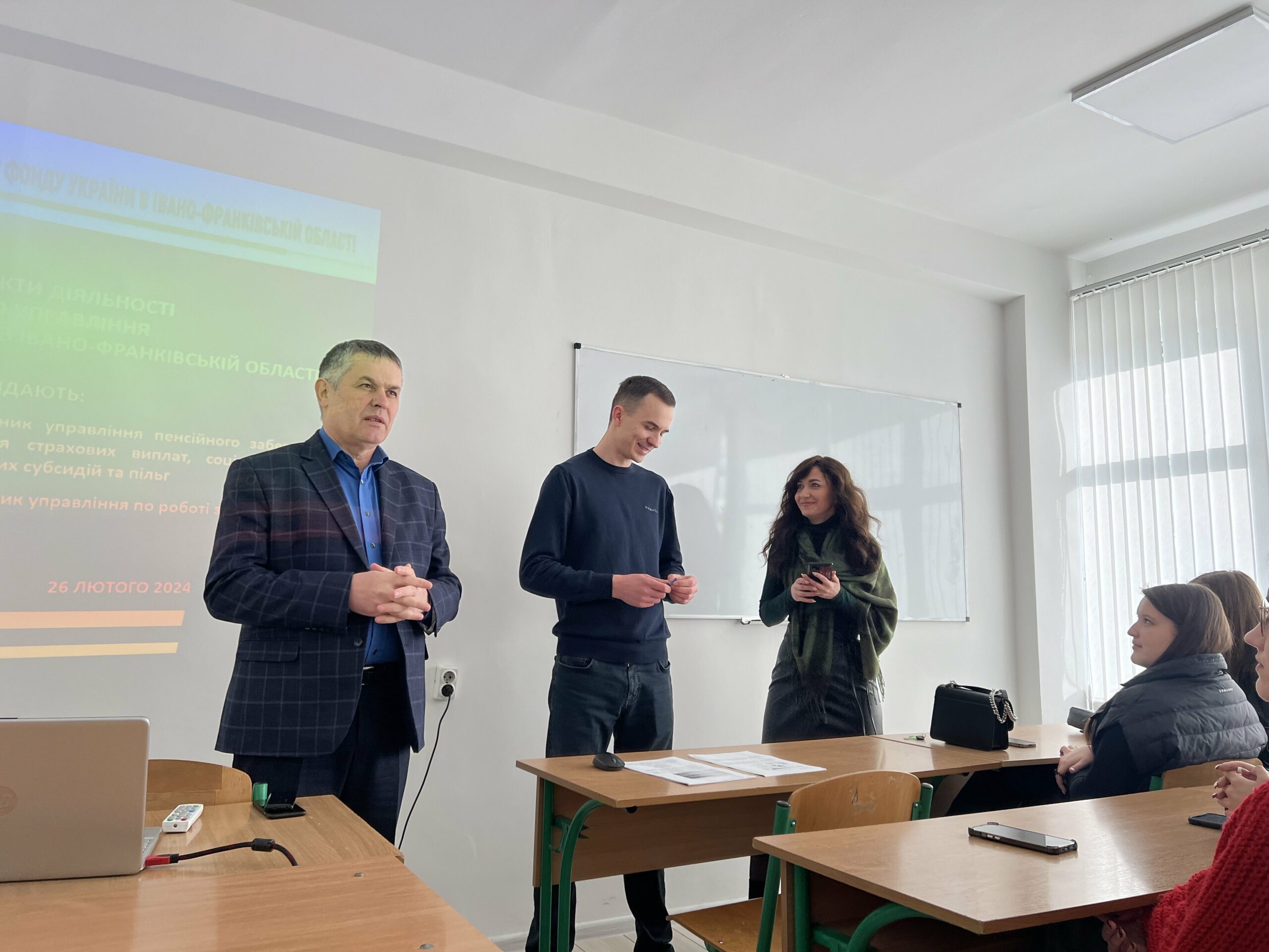 Відбулася зустріч студентів спеціальності “Публічне управління та адімністрування” з висококваліфікованими та досвідченими фахівцями Головного управління Пенсійного фонду України в Івано-Франківській області: Наталією Івасишин начальником управління пенсійного забезпечення, надання страхових виплат, соціальних послуг, житлових субсидій та пільг та Степаном Чорним начальником управління по роботі з персоналом.