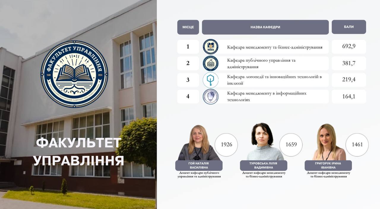 Доцент кафедри публічного управління та адміністрування, кандидат економічних наук Гой Наталія Василівна за підсумками професійної діяльності здобула перше місце серед викладачів факультету управління!