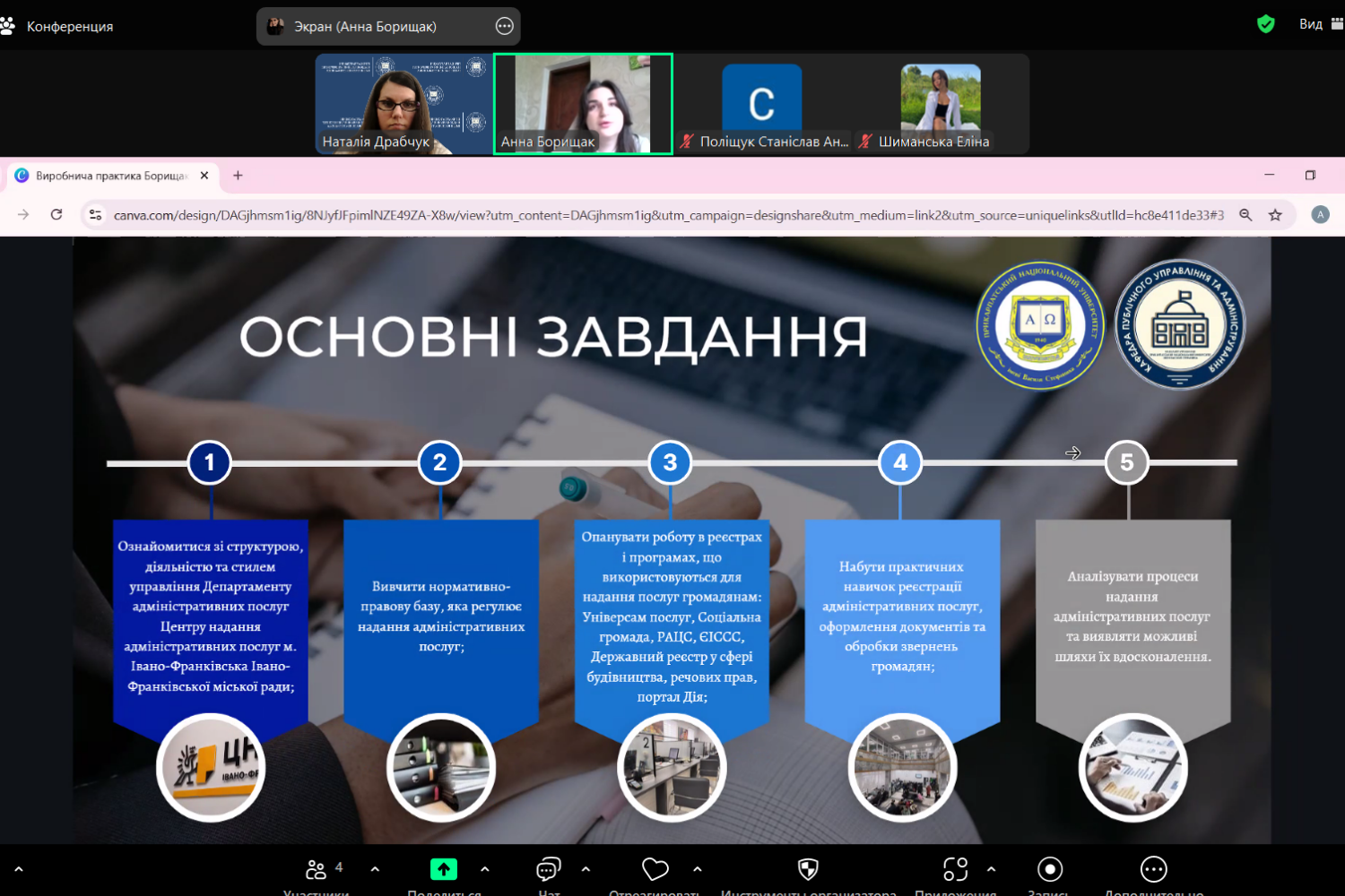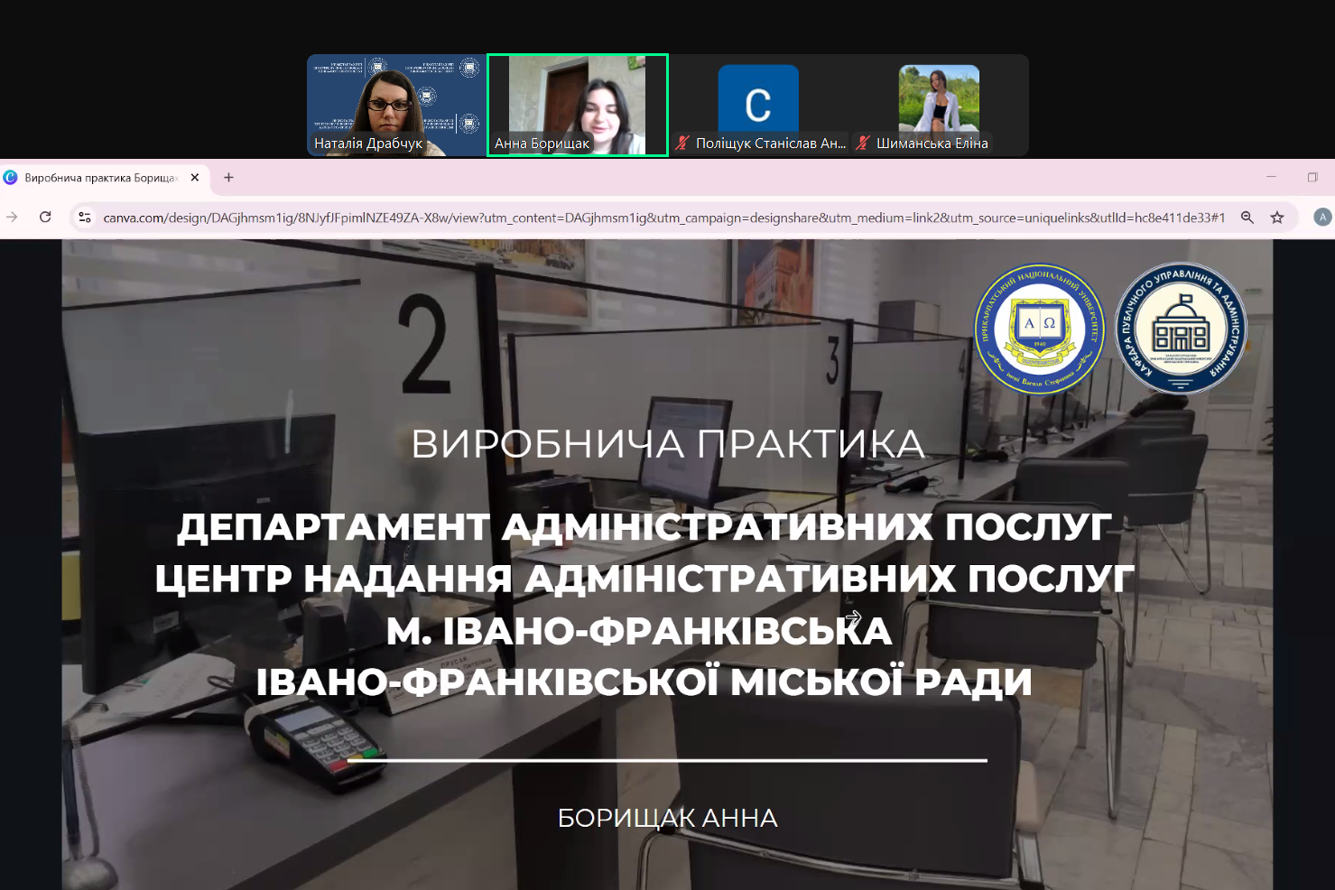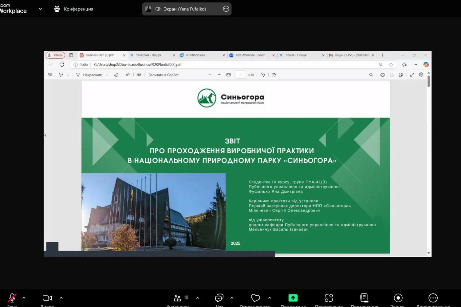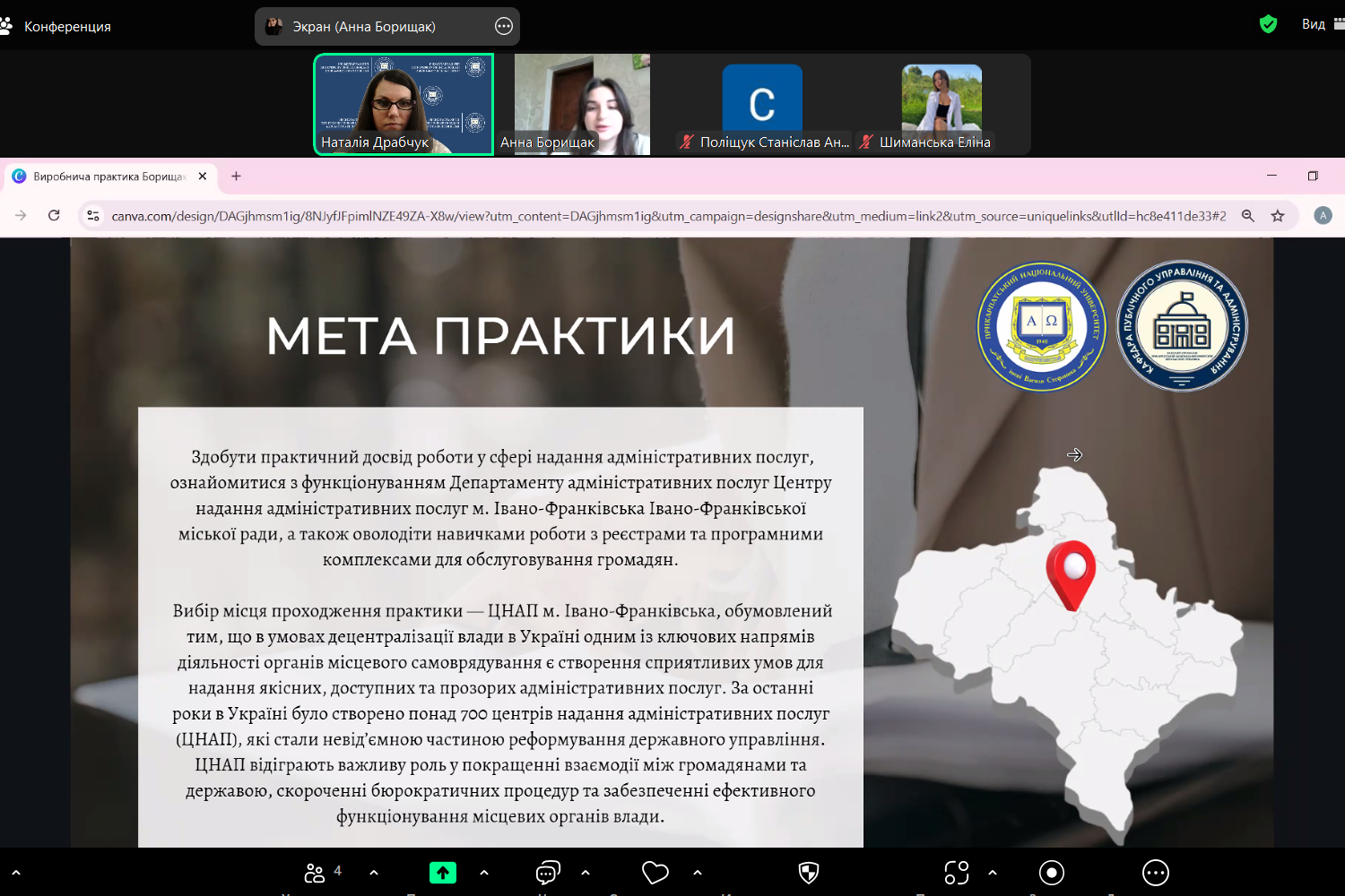 Відбувся захист виробничої практики студентів 4 курсу спеціальності “Публічне управління та адміністрування”. Захід став підсумком важливого етапу професійної підготовки, де студенти представили результати практичної діяльності в органах державної влади, місцевого самоврядування, громадських організаціях та інших установах.