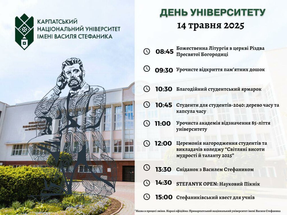 14 травня 2025 року — особливий день для нашої великої академічної родини. Прикарпатський (Карпатський) національний університет імені Василя Стефаника відзначає 85 років становлення, розвитку та лідерства у сфері освіти і науки!