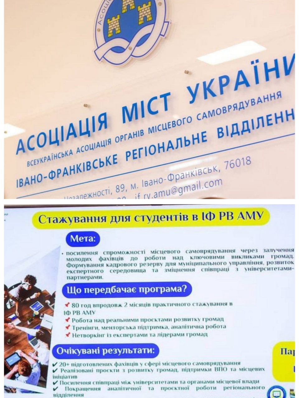 ????Стажування у Івано-Франківському РВ Асоціації міст України стає цінним досвідом для наших студентів, дозволяючи їм розширювати свій кругозір, поглиблювати знання та розвивати практичні навички, які необхідні для успішної кар’єри у сфері публічного управління та адміністрування.