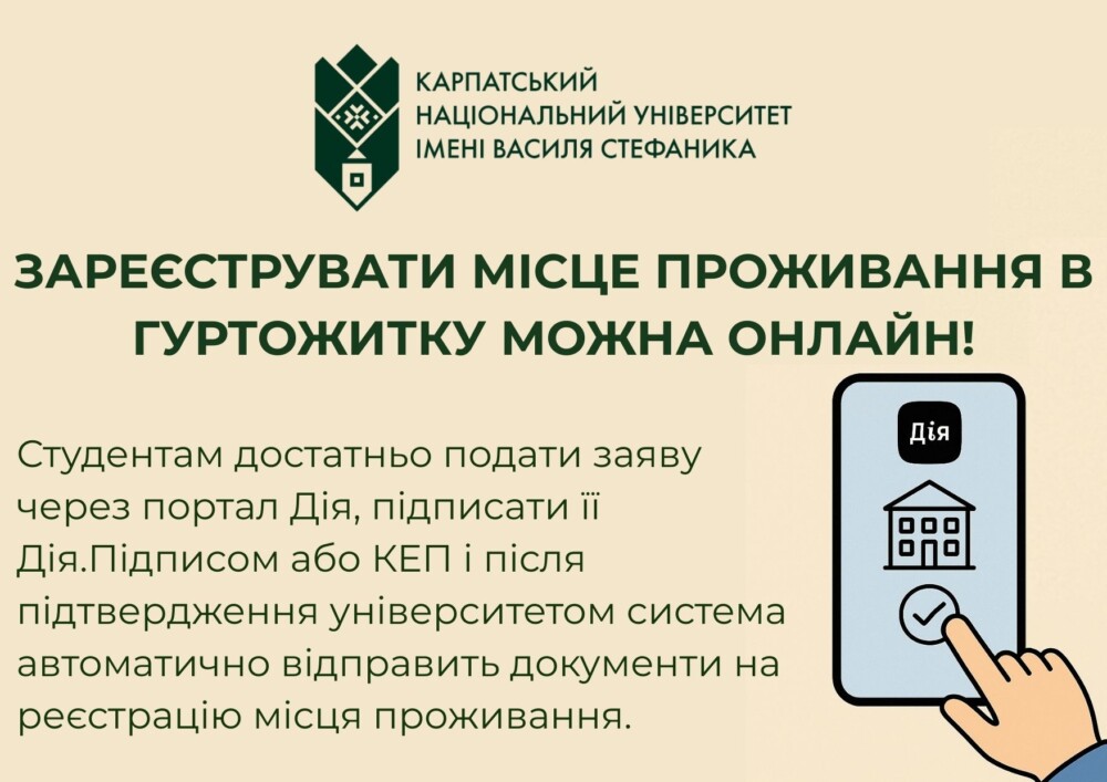 Карпатський національний університет імені Василя Стефаника приєднався до нової зручної послуги в «Дії» — тепер зареєструвати місце проживання у гуртожитку можна онлайн!
