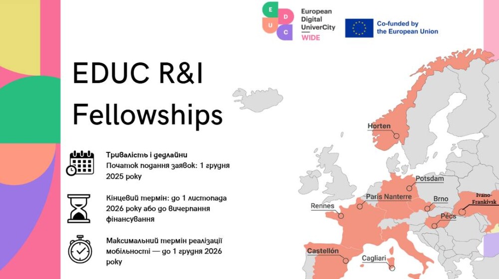 Карпатський національний університет імені Василя Стефаника запрошує викладачів та аспірантів університету подати заявку на участь у новому європейському конкурсі EDUC Research & Innovation Fellowships, який фінансується Європейським Союзом у межах проєкту EDUC-WIDE.