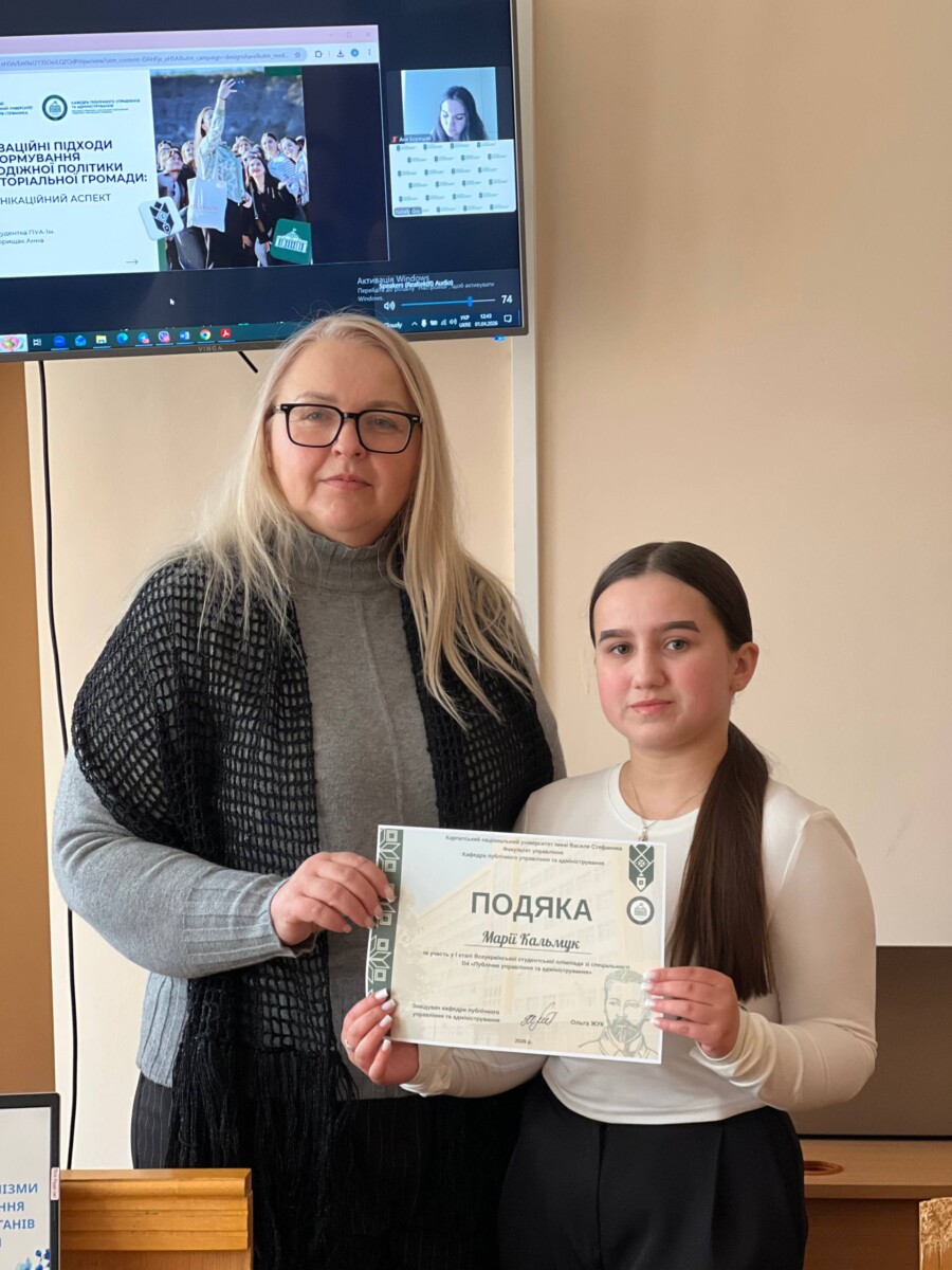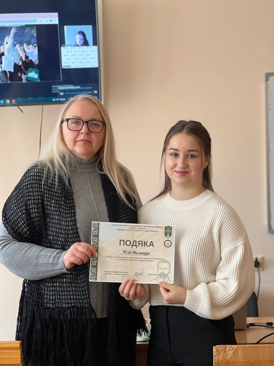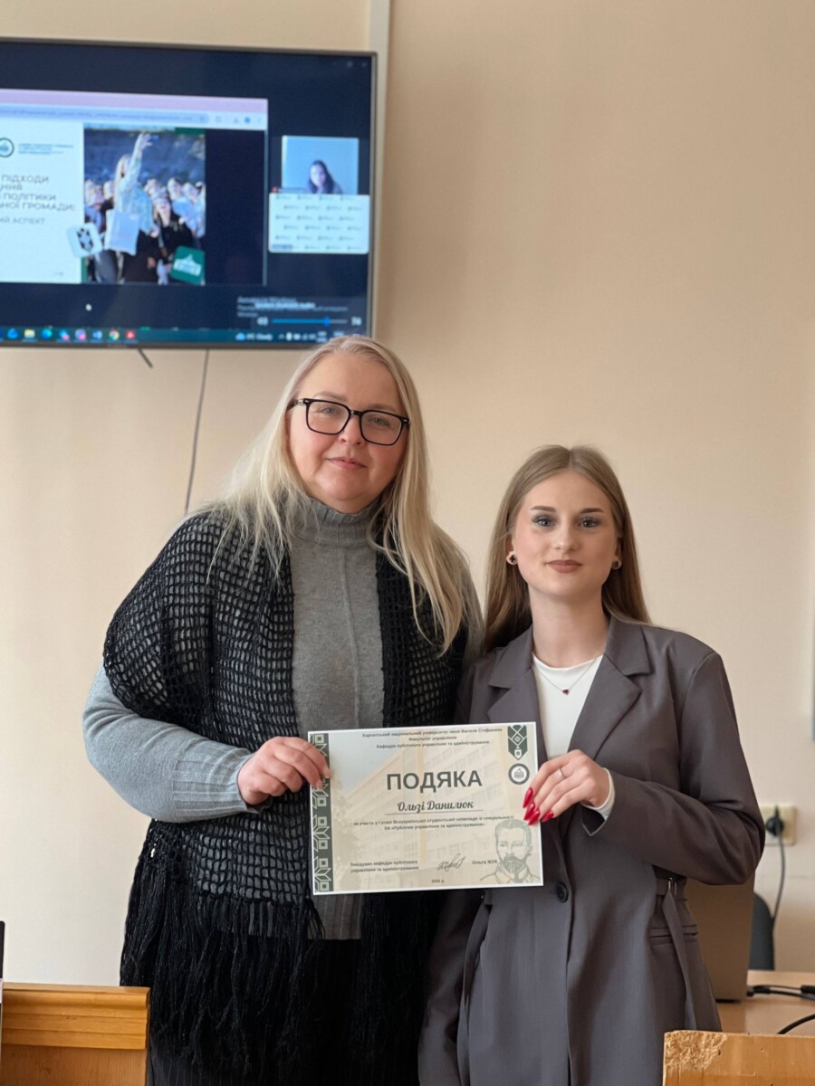 – ІІІ місце – студентка групи ПУА-11 Галів Ольга Мар’янівна з темою: «Використання технологій штучного інтелекту в управлінні розвитком Івано-Франківської міської територіальної громади».