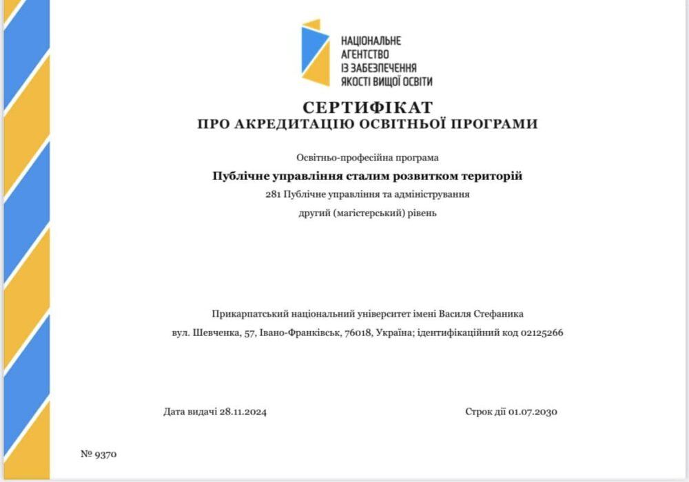 The educational program “Public Management of Sustainable Territorial Development” in the specialty 281 “Public Administration and Administration” has been successfully accredited.