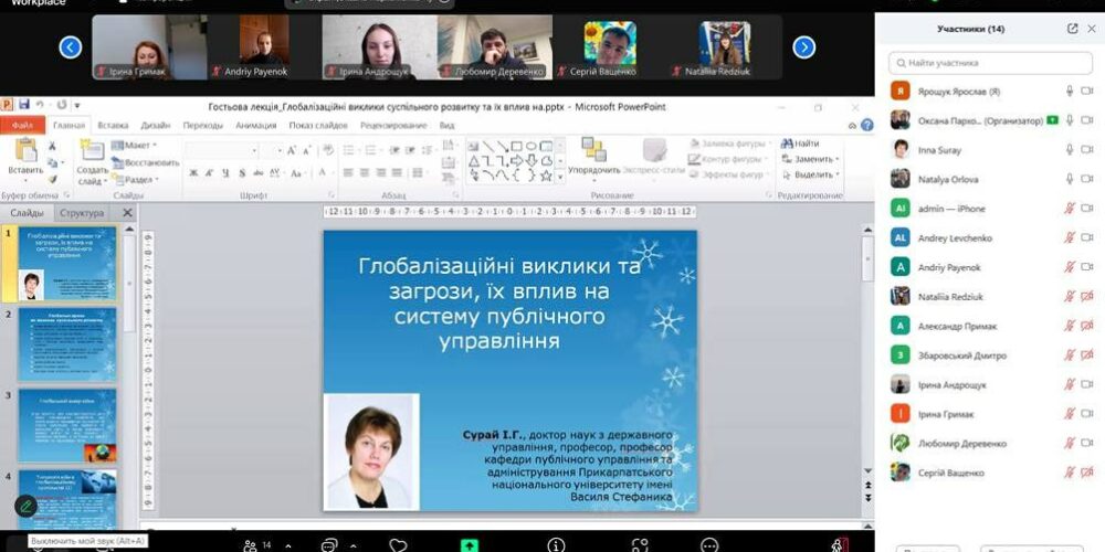 On February 10, 2025, a guest lecture by Inna Suray, Doctor of Science in Public Administration, Professor of the Department of Public Administration and Administration of the Vasyl Stefanyk Precarpathian National University, was held for applicants of the first bachelor’s, second master’s and third (educational and scientific level) higher education at the Faculty of Humanities and Social Technologies of the Hryhoriy Skovoroda University in Pereyaslav on the topic: “Globalization challenges and threats, their impact on the public administration system”. During the guest lecture, Inna Gennadiivna considered the main aspects of globalization processes that determine new challenges for public administration in Ukraine and the world. She also emphasized the economic, social and political threats arising from global changes, as well as the need to adapt the public administration system to these conditions.