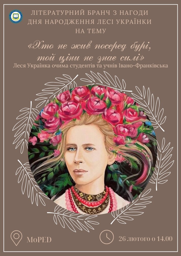 We invite you to a literary brunch dedicated to Lesia Ukrainka’s birthday on the theme “Who has not lived in the midst of a storm does not know the price of strength.” The event will take place on February 26 at 2:00 PM at the Center for Educational Technologies (57 Shevchenka Street, main building). The event will feature students and pupils from Ivano-Frankivsk, university scholars, and the local community.